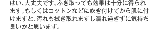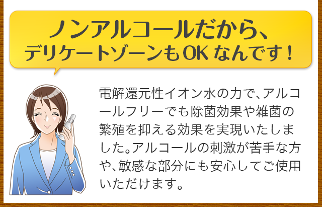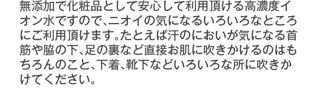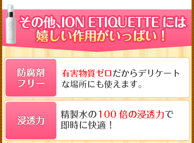 お風呂直後でないときに持ち歩けるスプレータイプのイオン エチケットを使ってみました。匂いに不快な気持ちが快適な気持ちになりました!今では匂いケア対策のために習慣のように一日数度スプレーしています。持ち歩けて瞬時に使えることが私にとっては非常に嬉しいです。